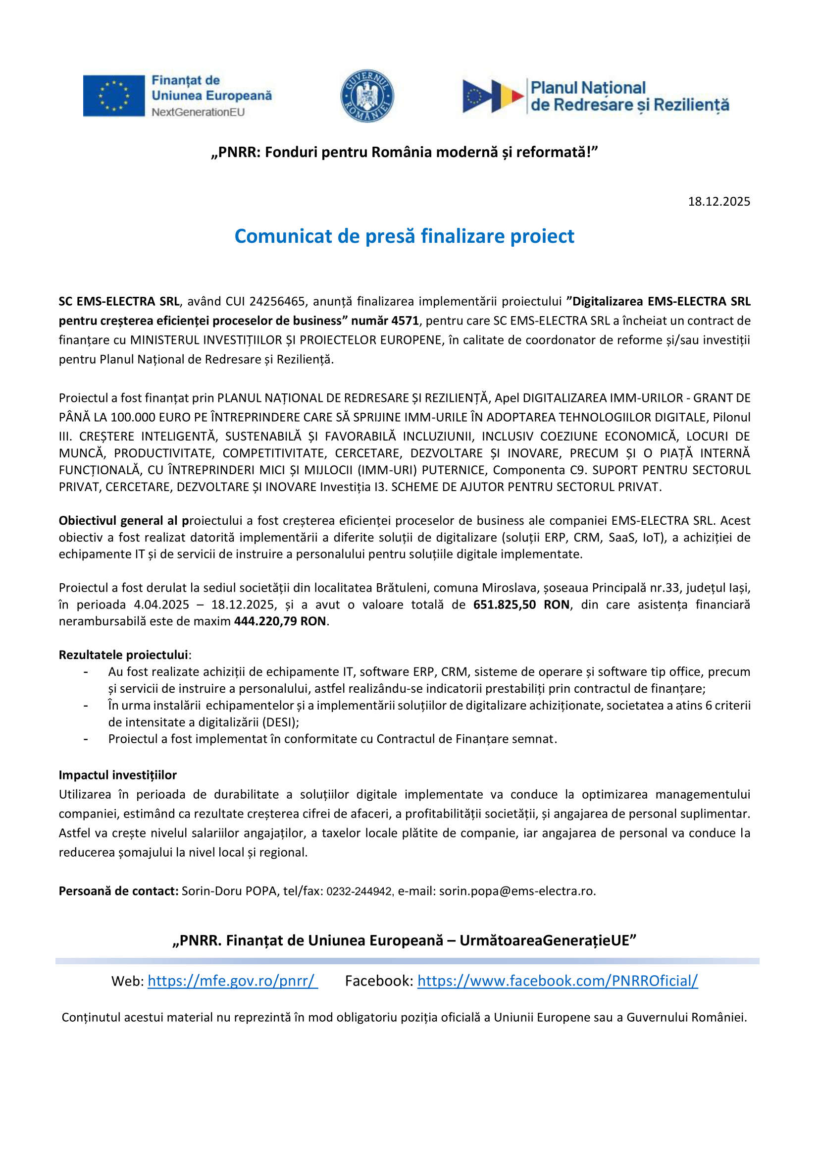 FINALIZAREA PROIECTULUI "Digitalizarea EMS-ELECTRA SRL pentru creșterea eficienței proceselor de business"